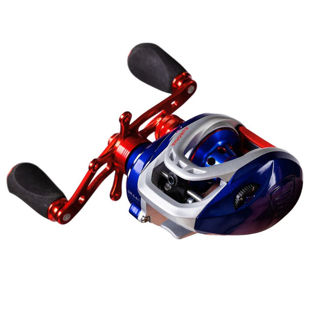 The Defender casting reel provides exceptional value for the money. The cutting-edge design uses carbon composite body with a 5-ball bearing system that will ensure this reel performs trip after trip. The magnetic braking system with external adjustment ensures that different size lures can be used without sacrificing time and casting efficiency. The EVA soft touch knobs on the machined metal handle promises comfort on every retrieval.