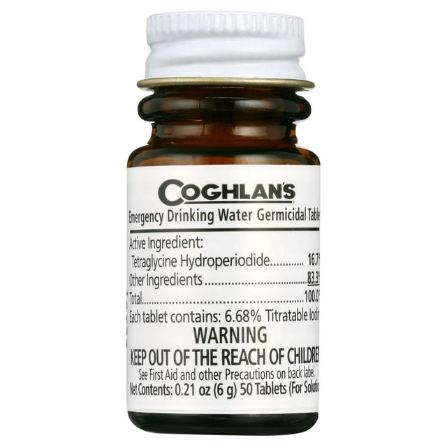 Coghlan's Emergency Drinking Water Germicidal Tablets rapidly dissolve to make most water suitable for drinking in emergency situations. Two of these germicidal iodine-based tablets will disinfect approximately one quart of water, making it safe for human consumption. Perfect for any first aid or survival kit, these tablets give peace of mind that you'll have a backup plan for disinfecting water.