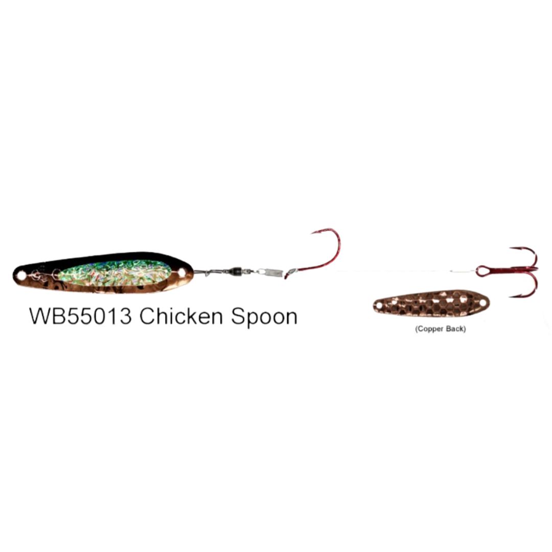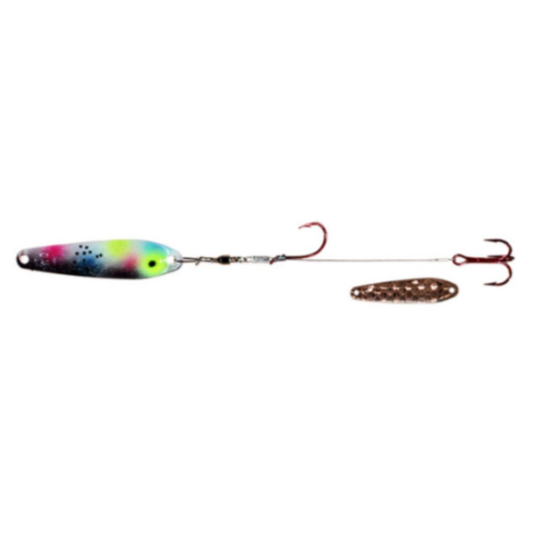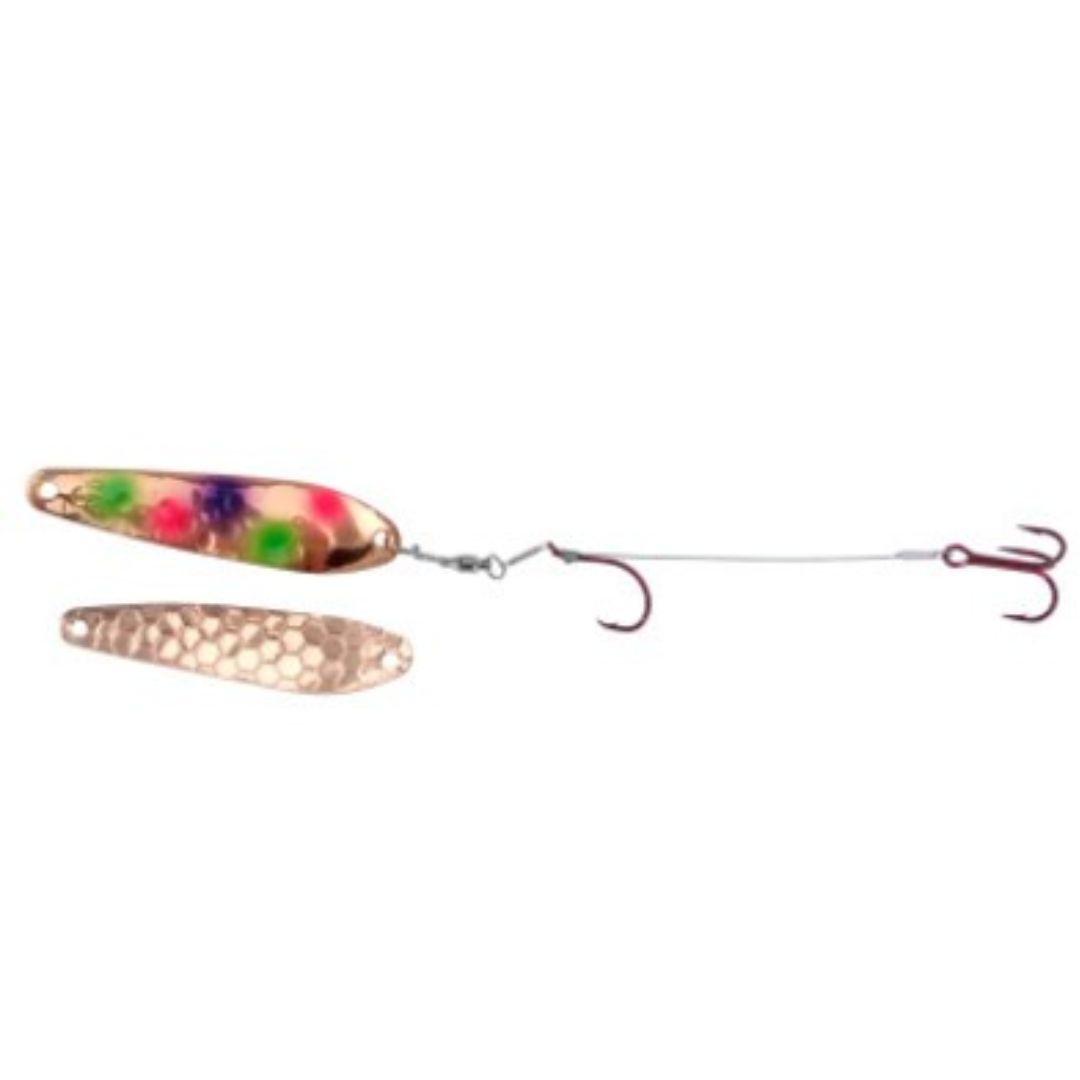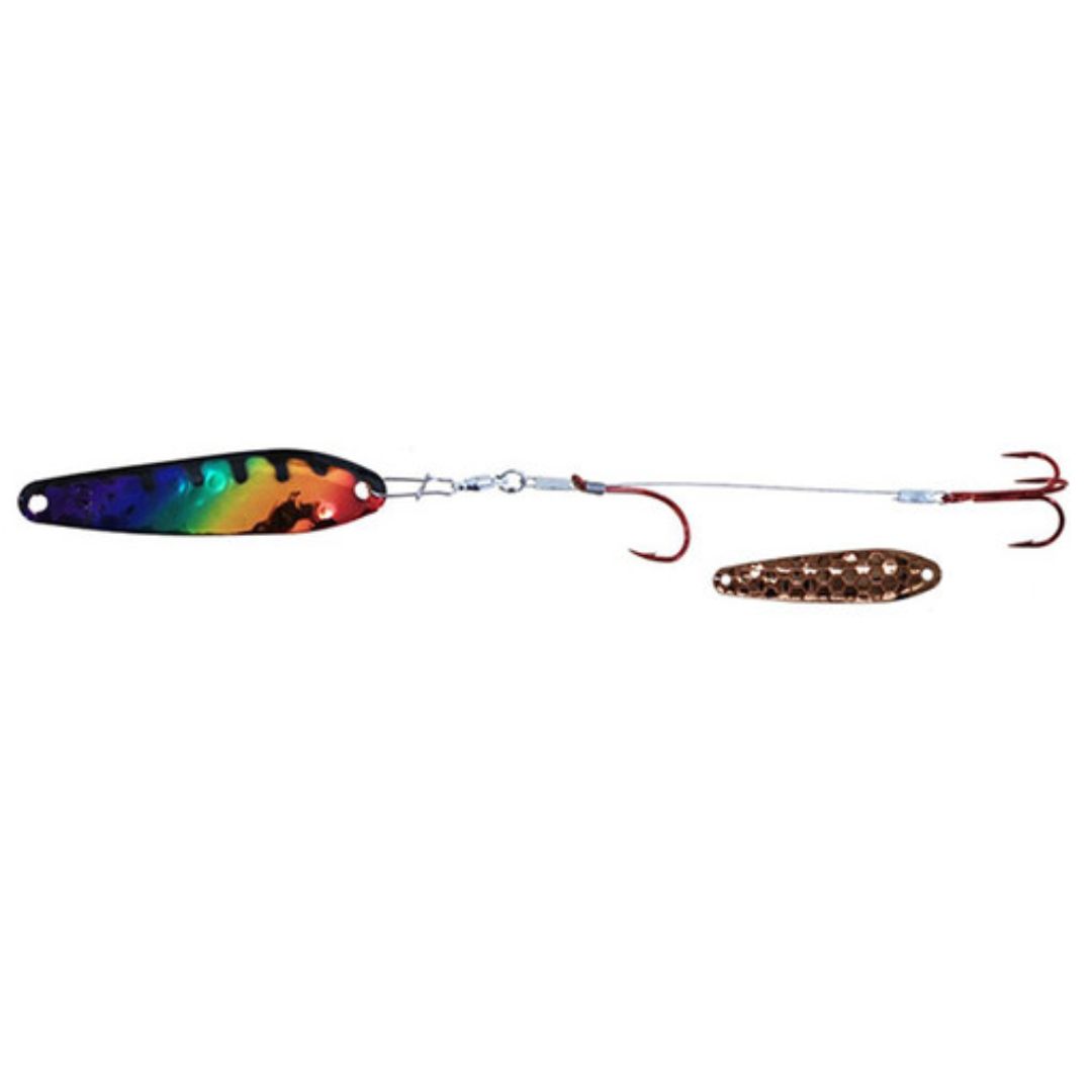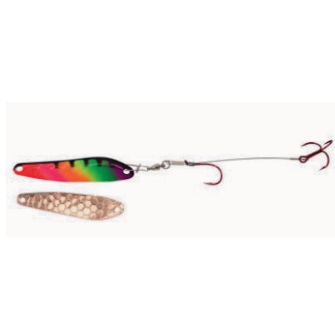 Dreamweaver Wormburners combine a Dreamweaver WD Series trolling spoon with standard wire crawler harness giving the angler a whole new bait design that fish have never seen before. Unlike other crawler harnesses that have to be trolled at very slow speeds, the Wormburner allows you to troll up to 4 mph! Because of this, the Wormburner can be trolled with crank and stick baits and spoons, baits that traditionally are trolled at faster speeds. Wormburner live bait harnesses features a ball bearing swivel and a single size two red octopus hook with a size four red treble hook stinger.