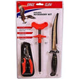 Eagle Claw 3 piece angler’s accessory kit Kit includes: – 5″ Split ring plier with sheath – 9″ Hook remover – 6 1/4″ Fillet knife with sheath split ring plier specifications: – size: 5″ – material: stainless steel – handle color: orange – includes: Black sheath hook remover specifications: – length: 9″ – material: stainless steel – color trim: orange fillet knife Specifications: – blade length: 6 1/4″ – material: 3CR14 stainless steel – built-in scaler – handle color: black – includes: Black sheath