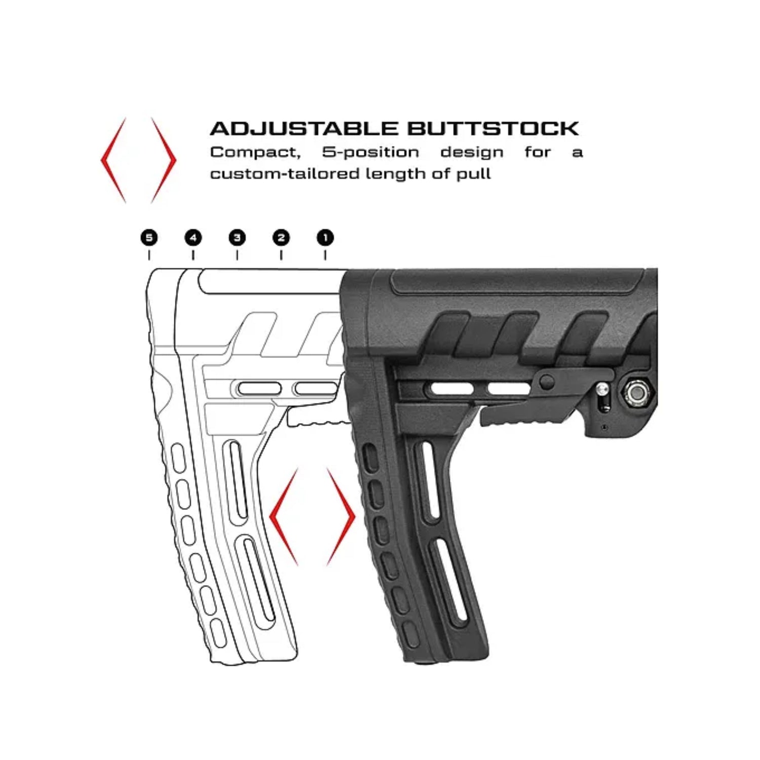 - ADJUSTABLE BUTTSTOCK - Compact, multi-position design for a custom-tailored length of pull.