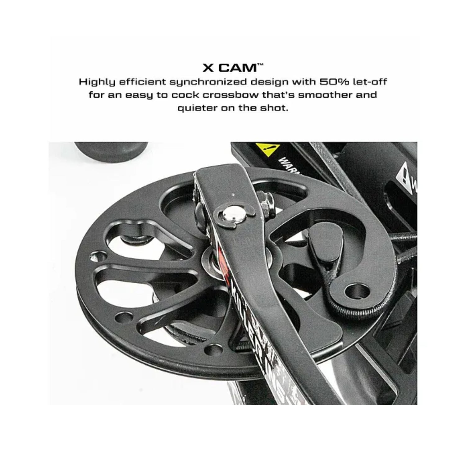 - X CAM - Synchronized highly efficient design with 50% let off for an easier-to-cock crossbow thats smoother and quieter on the shot.