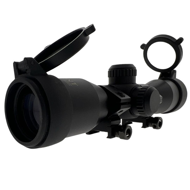 This lightweight 8.5-inch aluminum tube scope features 3 crosshairs and four dots calibrated for 20-, 30-, 40- and 50-yards, and a triangle for 60-yards (fourth dot and triangle are free-standing, just below the 40-yard crosshair). Available with non-illuminated black dots or one of two rheostat controlled illuminated, colored dots (red or green).