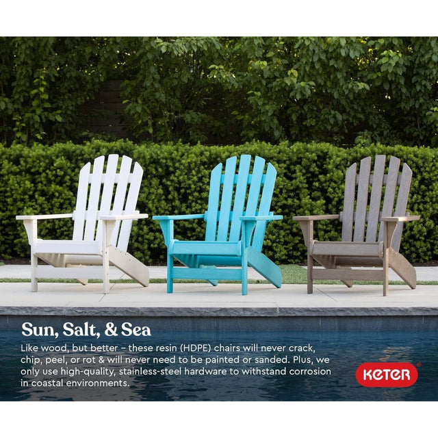 Our Lakeside Collection of Adirondack chairs offer the perfect complement to your backyard space. The Keter Tahoe Adirondack is a classic summer staple with its iconic design while being waterproof and UV-protected. This chair is perfect for lakeside adventures and can hold up to any weather, year after year. Combining traditional styling, the look and feel of wood, plus durable and maintenance-free materials, this chair will find a permanent spot in your garden, come rain or shine.
