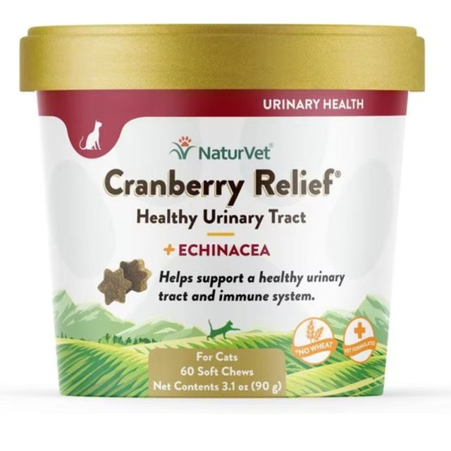Keep your kitty's business running smoothly with NaturVet Cranberry Relief Plus Echinacea Soft Chews Urinary Supplement for Cats. This daily supplement is formulated with cranberry to help promote a healthy urinary tract and bladder function. It also includes echinacea to support a strong immune system. Cranberry Relief is purr-fect for cats ages 12 weeks and older. Plus, it comes in an easy-to-feed soft chew!