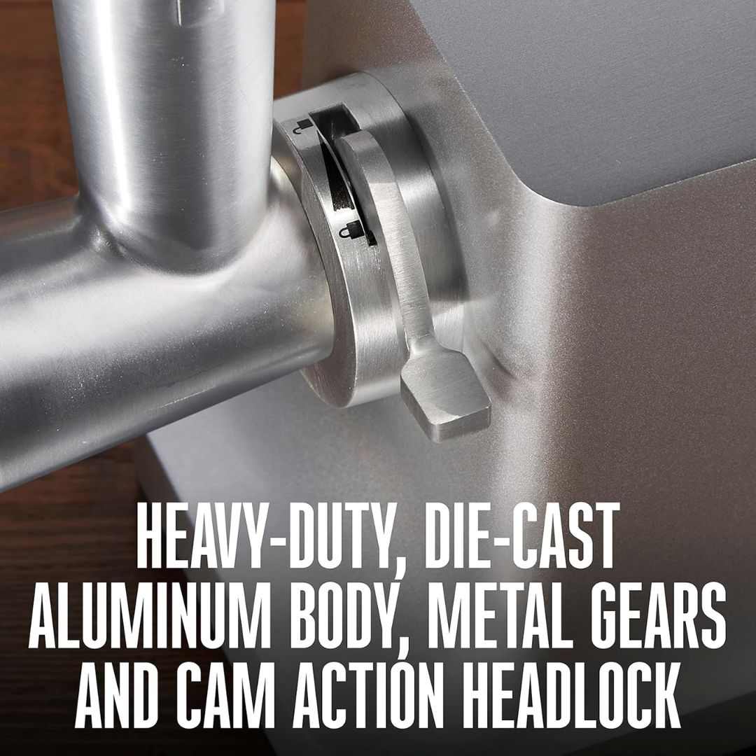 - Die-Cast Aluminum Body, Metal Gears and Cam Action Headlock: This durable meat grinder has a heavy-duty, die-cast aluminum body and metal gears The cam action headlock easily secures the grinding head, making it faster to connect and disconnect.