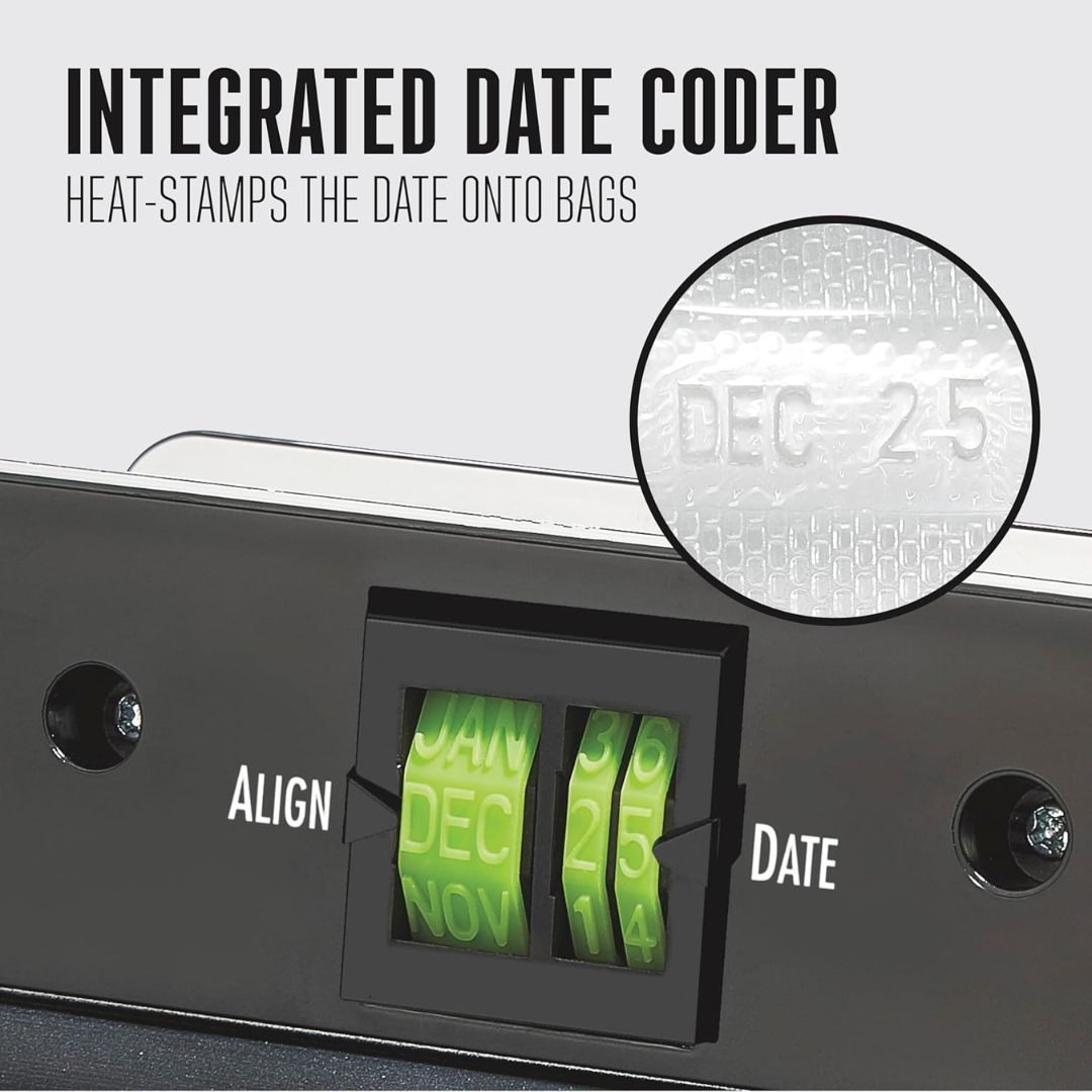 - INTEGRATED DATE CODER: This food vacuum sealer heat-stamps the date onto the bag to save you time. No marking required and no risk of the date rubbing off.