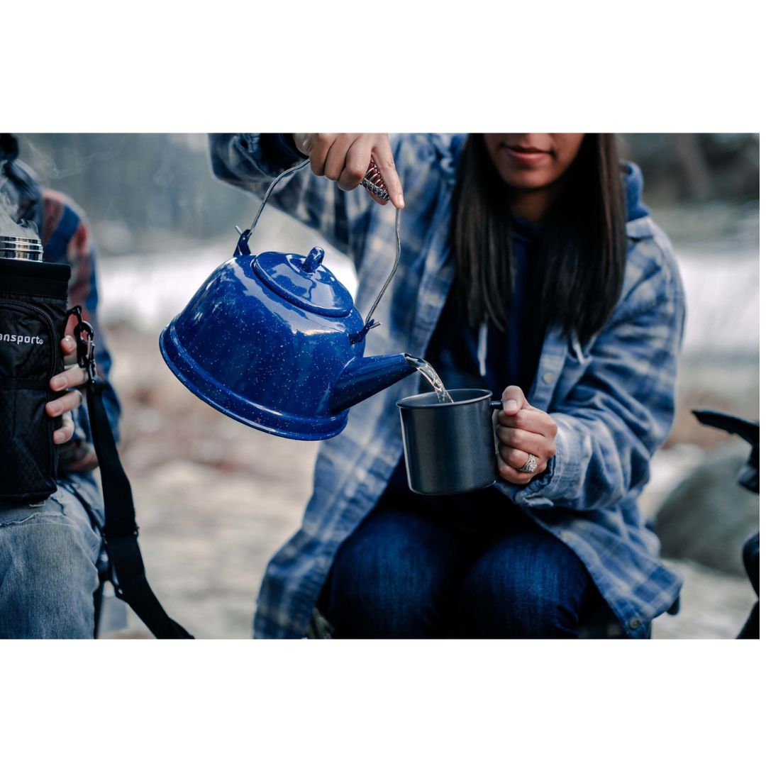 Fancy a spot of tea, or just a few quarts of hot water for cocoa or coffee? Our enamel tea kettle is happy to oblige! With a capacity of 2.6 quarts, our kettle features a wire bail handle with a coil grip for easy, cool pouring. The enamel is kiln-hardened to prevent chips and scratches, allowing you to enjoy hot beverages wherever you are.