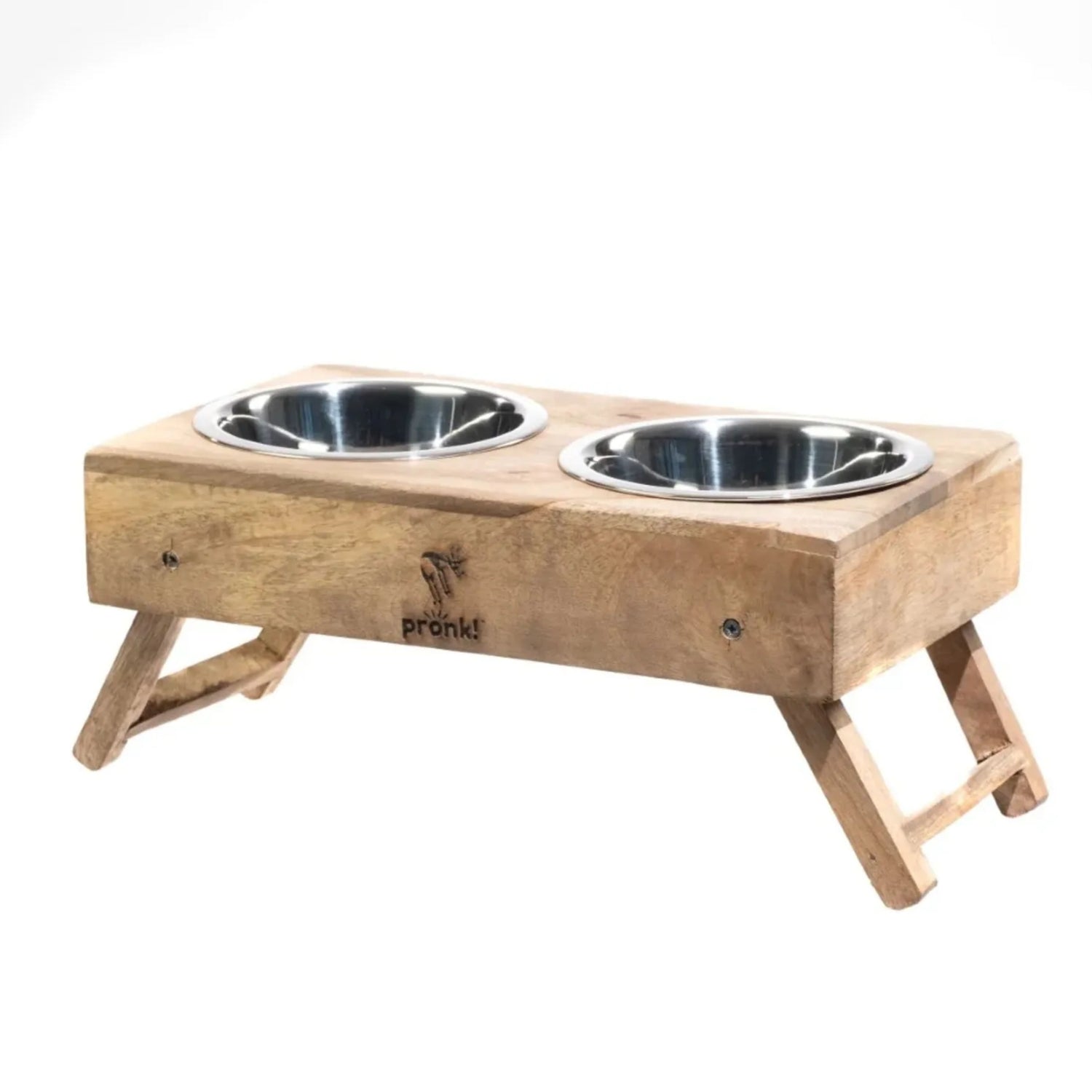 Farmhouse chic dog feeder features (2) removeable stainless steel bowls and (1) wood stand. Quickly and easily adjust height from 5.5" to 2" by folding feet of stand down; Stand measures approximately 12.5 x 6.5 inches. Stand is made of quality mango wood material with rustic finish; Bowls made of 100% quality stainless steel. Collapsible feet fold neatly under the stand to easily store and transport. Stand- hand wash only, wipe clean with damp cloth; Wash bowls with warm water and mild soap, towel dry.