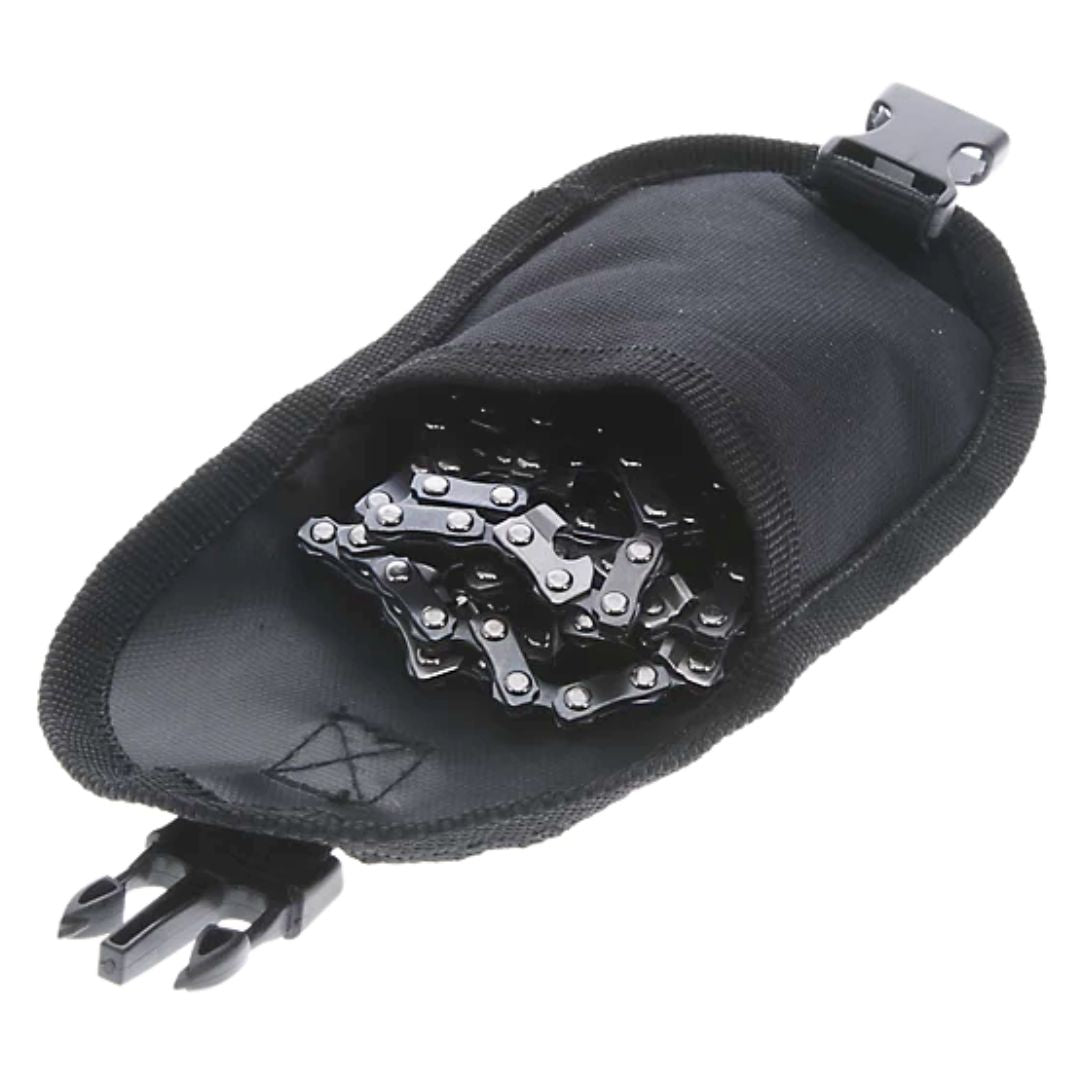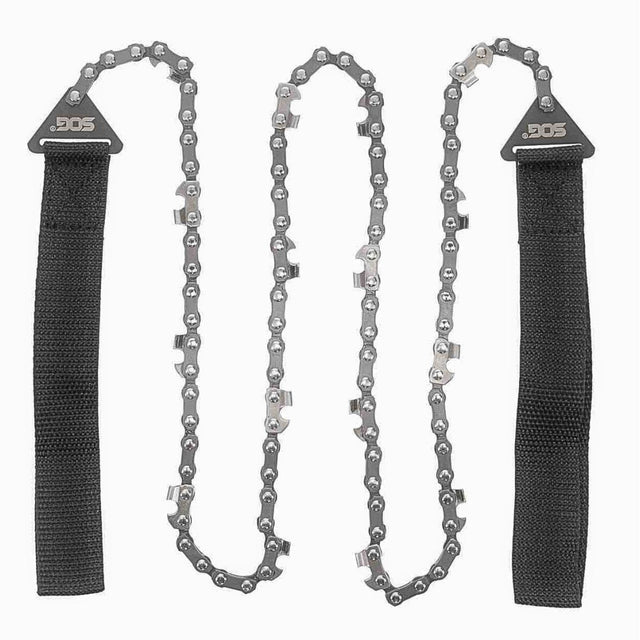 Featuring a 36" high-carbon steel chain with bi-directional cutting teeth, the SOG Pocket Chainsaw is hands-down the ultimate outdoor survival tool for suvivalists and outdoor adventurers. Compact and lightweight, it boasts a sleek black finish and heavy-duty nylon wrist handles for a comfortable, fatigue-free grip. Comes with a nylon carry case for safe storage and transport.